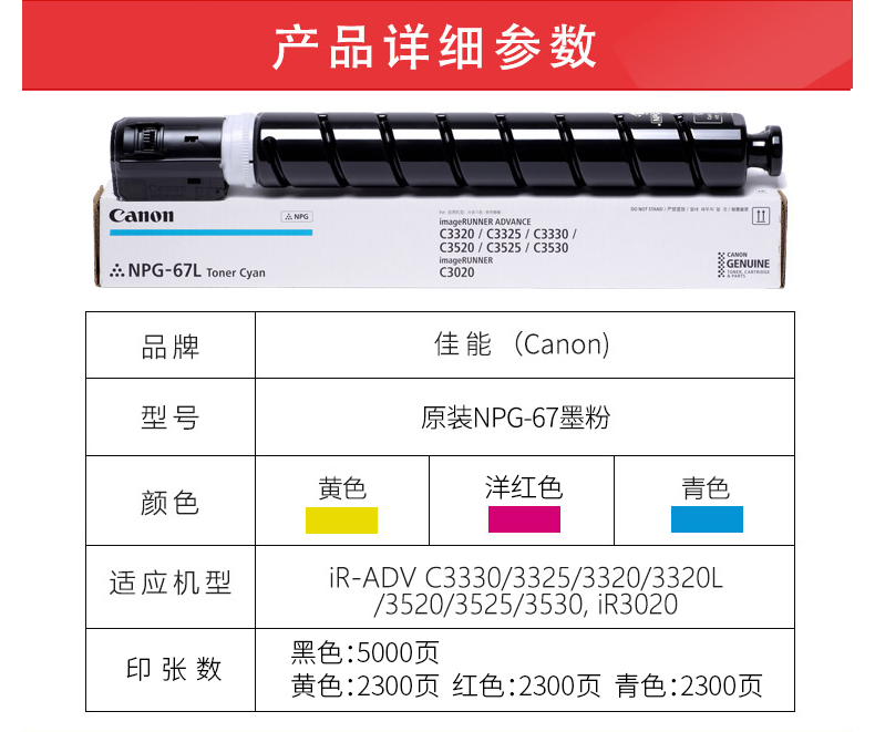• 商品名称:佳能原装NPG-67L黄色粉盒iRC3020 C3330 C3325 C3320 C3520 C3525 C3025 C3530黄色碳粉墨粉经济装粉筒正品