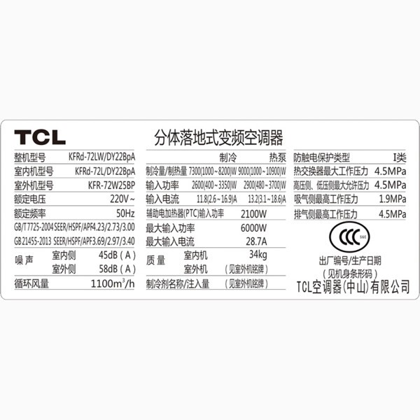 • 商品名称:TCL KFRd-72LW/DY22BpA 大3匹冷暖变频柜机空调