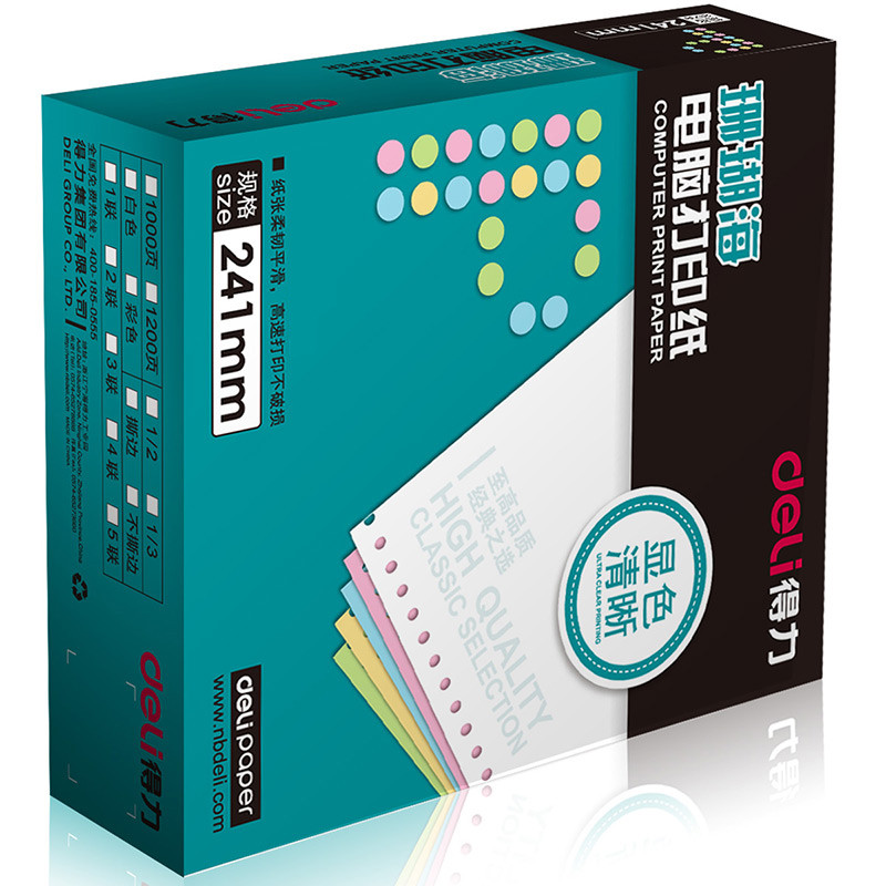 • 商品名称:得力(deli)珊瑚海彩色电脑打印纸S241-4-1/2CS四联二等分80列(撕边 色序:白红蓝黄 1000页/箱)