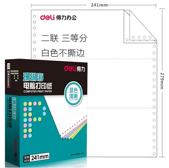 • 商品名称:得力(deli)珊瑚海S241-2-1/3二联三等分80列不撕边 白色 电脑打印纸 1000页/箱