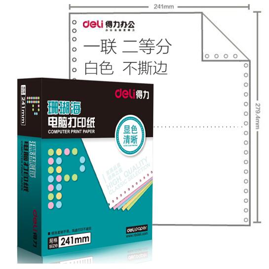 • 商品名称:得力(deli)珊瑚海白色电脑打印纸S241-1-1/2一联二等分二等分整张不撕边80列 (色序:全白 1000页/箱)