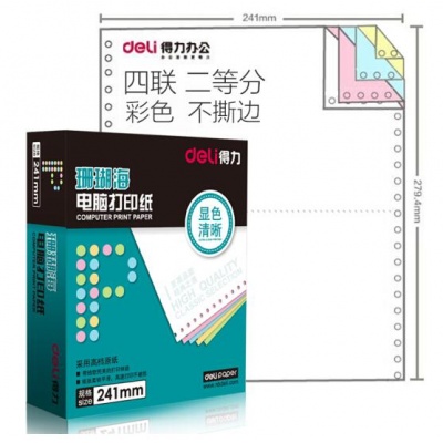 • 商品名称:得力(deli)珊瑚海彩色电脑打印纸S241-4-1/2C四层二等分80列(不撕边 色序:白红蓝黄 1000页/箱)